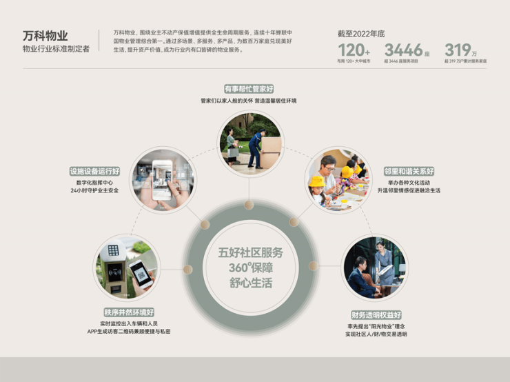 万科物业服务,同样也是物业服务的标准引领者,连续十年蝉联中国物业管理综合排名TOP1。万科物业,围绕业主不动产保值增值提供全生命周期服务,通过多场景、多服务、多产品,用好服务让社区历久弥新,为全国319万家庭兑现美好生活。