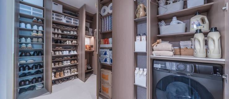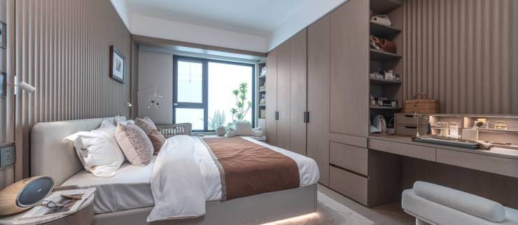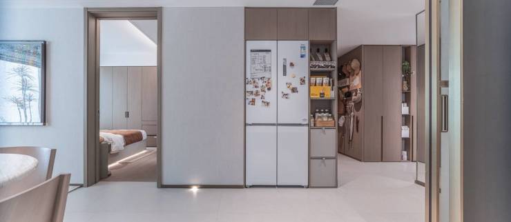 万科东庐以“功能场景设计先行,户型空间设计后置”原则,先跟居生活需求设计收纳、家电方案,再根据收纳和电器方案设计户型,以做到空间的严丝合缝。约18组柜体,约27.1m³收纳空间,满足一家人的收纳需求。