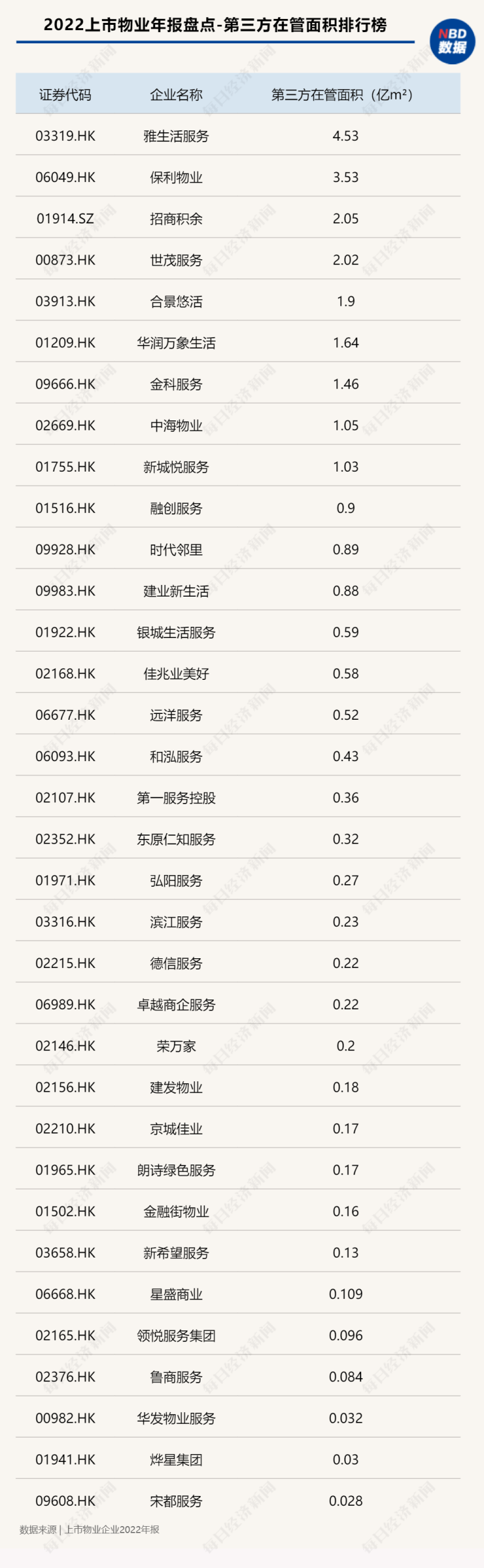 《每日经济新闻》记者统计发现,目前已发布2022年报的53家上市物企中,共有34家物企披露了来自第三方的在管面积数据,其中有15家物企第三方在管面积占比超50%。