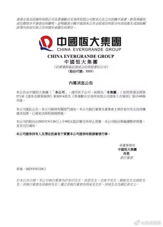 9月28日,中国恒大在港交所公告:本公司接到有关部门通知,本公司执行董事及董事会主席许家印先生因涉嫌违法犯罪,已被依法采取强制措施。本公司的股份由2023年9月28日上午9时正起于联交所停止买卖。本公司股份将继续暂停买卖,直至另行通知。