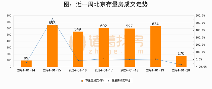 从存量房来看,2024年01月20日北京存量房单日成交170套,比昨日减少464套,环比下降73.2%。从近一周存量房成交来看,北京存量房日均成交套数为471套,01月20日单日成交170套,低于近一周平均水平63.9%。