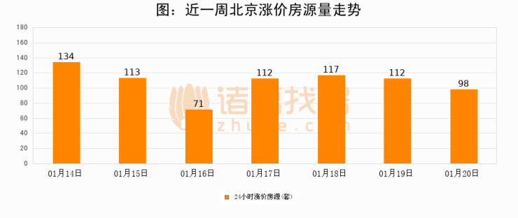 根据诸葛找房数据显示,北京24小时涨价房源量为98套,较01月19日减少14套,环比下降12.5%。与此同时,涨价房源占比小幅回落,对于购房者来说是一个入市窗口期,购房者可抓住时机入市。