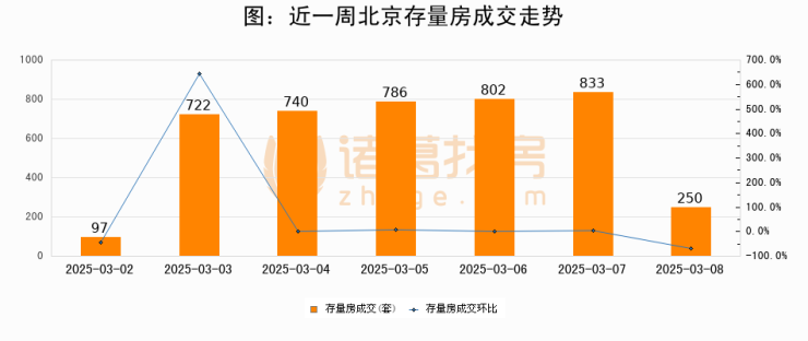 从存量房来看,2025年03月08日北京存量房单日成交250套,比昨日减少583套,环比下降70%。从近一周存量房成交来看,北京存量房日均成交套数为604套,03月08日单日成交250套,低于近一周平均水平58.6%。