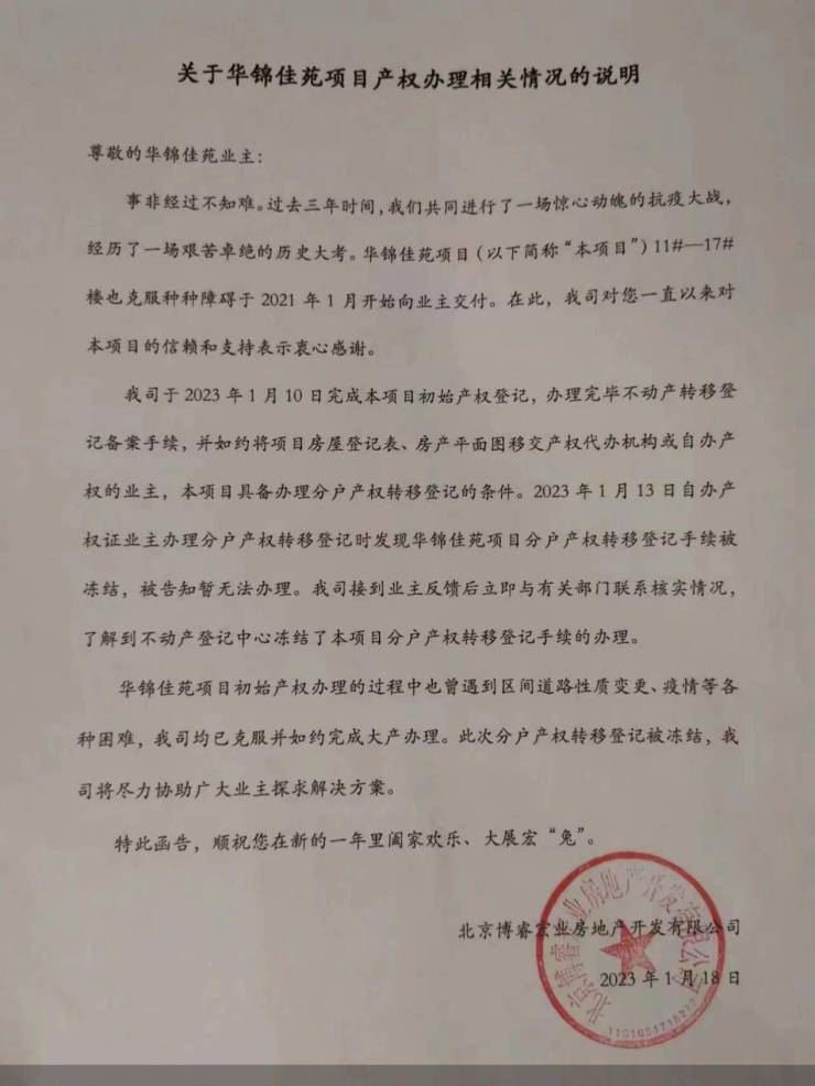 2023年1月18日,开发商方面给出了一份“关于华锦佳苑(和悦华锦)项目产权办理相关情况的说明”,其中提及,项目具备办理分户产权转移登记的条件,但在2023年1月13日自办产权证业主办理分户产权转移登记时发现华锦佳苑项目分户产权转移登记手续被冻结,被告知暂无法办理。接到业主反馈后立即与有关部门联系核实情况,了解到不动产登记中心冻结了本项目分户产权转移登记手续的办理,但依然没有解释冻结的原因。
