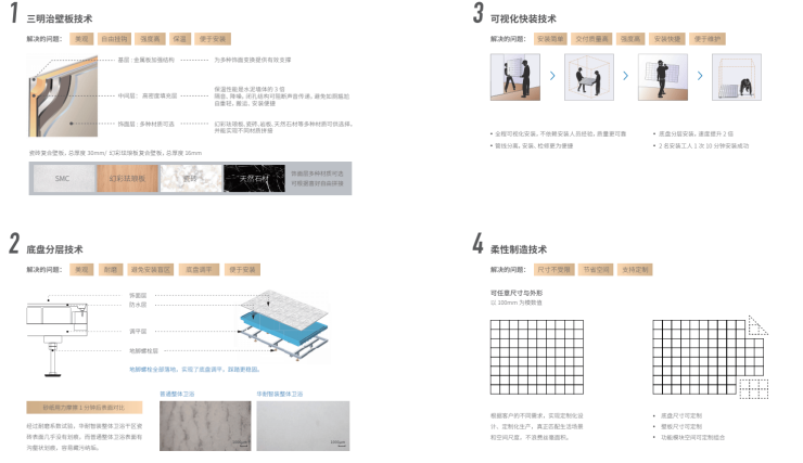 技术专利是华耐智装的核心竞争力之一,目前已累计获得 60 余项专利。其研发的底盘分层技术,有效提升了整体卫浴底盘的防水性能与结构稳定性;硅瓷体系整体厨房,凭借硅瓷材料的优良特性,使厨房具备更好的耐高温、耐腐蚀、易清洁等性能;高强静音地面系统,通过特殊的材料与结构设计,降低了地面行走产生的噪音;多材质壁板组合设计,可根据不同场景与客户需求灵活组合;三明治壁板技术增强了壁板的保温、隔音、承重等性能;整体厨房壁板工艺优化了生产与安装流程。同时,华耐智装还积极参与国内整体卫浴和工业化内装相关行业标准的参编制定,为行业规范化发展贡献力量。