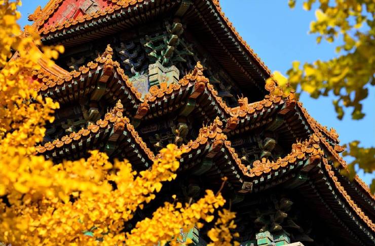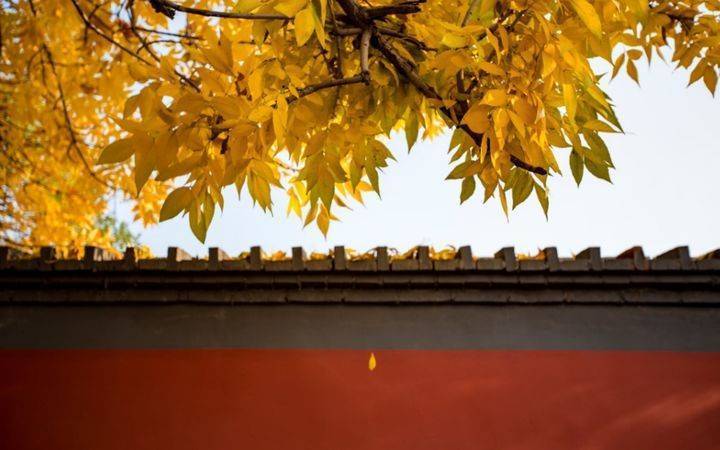 银杏树也许哪里都有,但用宫殿来衬,以红墙相依的,唯有京秋。正午时,阳光照进来,秋风微拂过,故宫东墙站成整齐一排的银杏树,叶片抖动犹如炽热的火焰,刹那间便用漫天漫地的金黄换了世界。