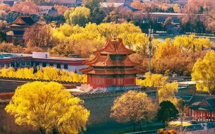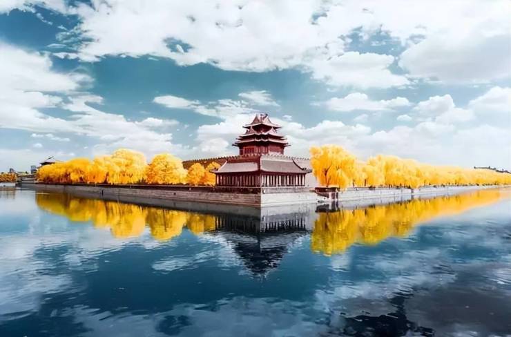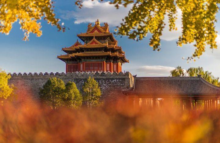 西南角楼处,护城河倒映着银杏剪影,两相交错间,给庄严的紫禁城增添了一丝温暖的余韵。立于紫禁之巅,遥望远处层峦叠嶂的醉红、朱柿、赪霞,那是西山的元宝枫、是远古的风声响、也是暖人的烟火气。