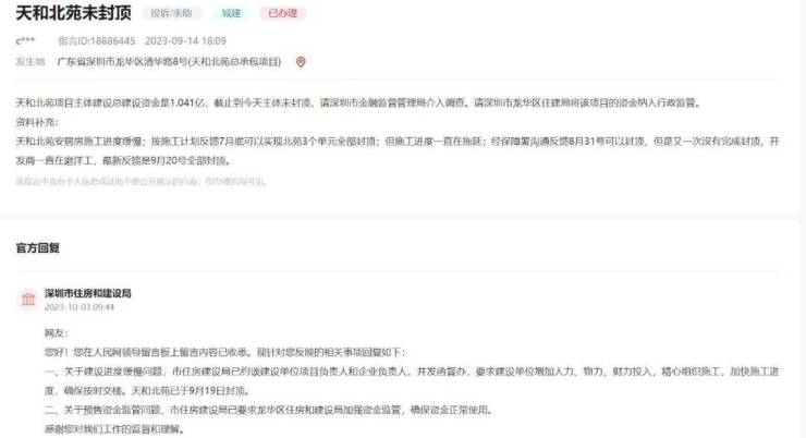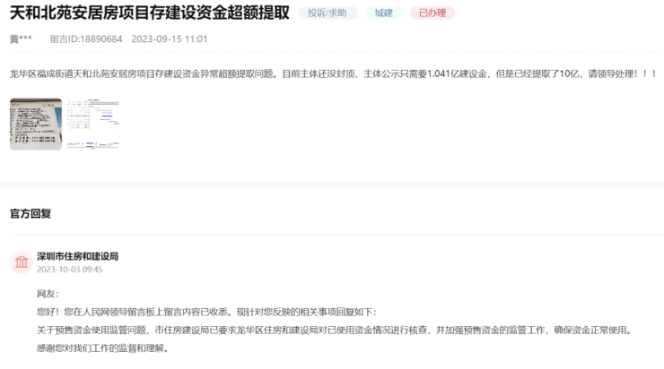 9月中旬,多名网友反映称,位于深圳龙华区的天和北苑项目建设进度缓慢,楼体未按照施工计划全部封顶,同时存在建设资金超额提取问题。主体建设总资金是1.041亿元,实际未完工就已经提取了10亿元。恳请有关部门介入调查,将资金纳入监管。