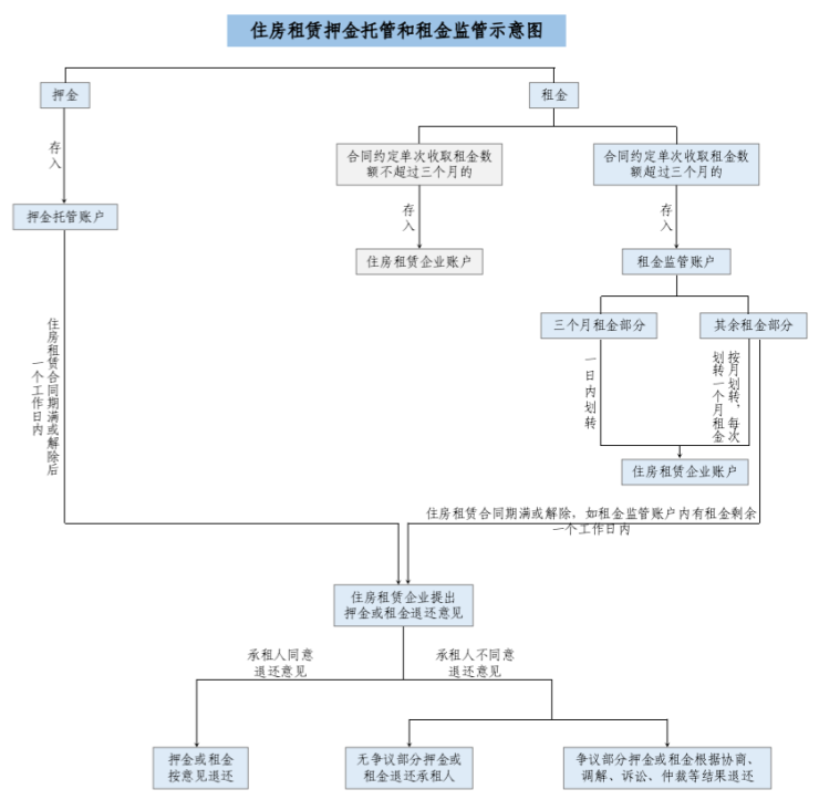 《征求意见稿》规定,押金按照住房租赁合同约定的时间、金额存入押金托管账户,租金方面,单次收取租金数额超过三个月的,租金按照合同约定时间、金额存入租金监管账户。其中三个月租金部分在一日内划转至住房租赁企业账户,其余租金按月划转,每次划转金额为一个月租金。