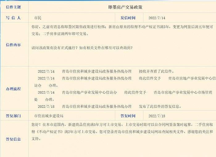 7月18日,青岛市住房和城乡建设局在回复市民提问时表示:在本市范围内,新建商品住房满5年方可上市交易,上市交易时限可以自合同网签备案时起算,二手住房取得《不动产权证书》满2年方可上市交易。