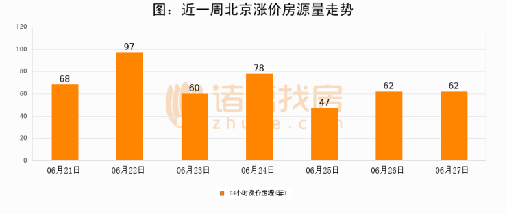 根据诸葛找房数据显示,北京24小时涨价房源量为62套,较06月26日持平。