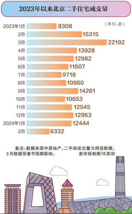 根据中指研究院数据,1-2月,北京新房市场表现平稳,累计成交约100万平方米,与去年同期基本持平,2月份新建住宅价格环比上涨0.17%,同比上涨0.98%;2月份,北京二手商品住宅成交约6000套,1-2月累计成交约1.8万套,同比下降约2成,二手住宅价格环比下跌0.49%。