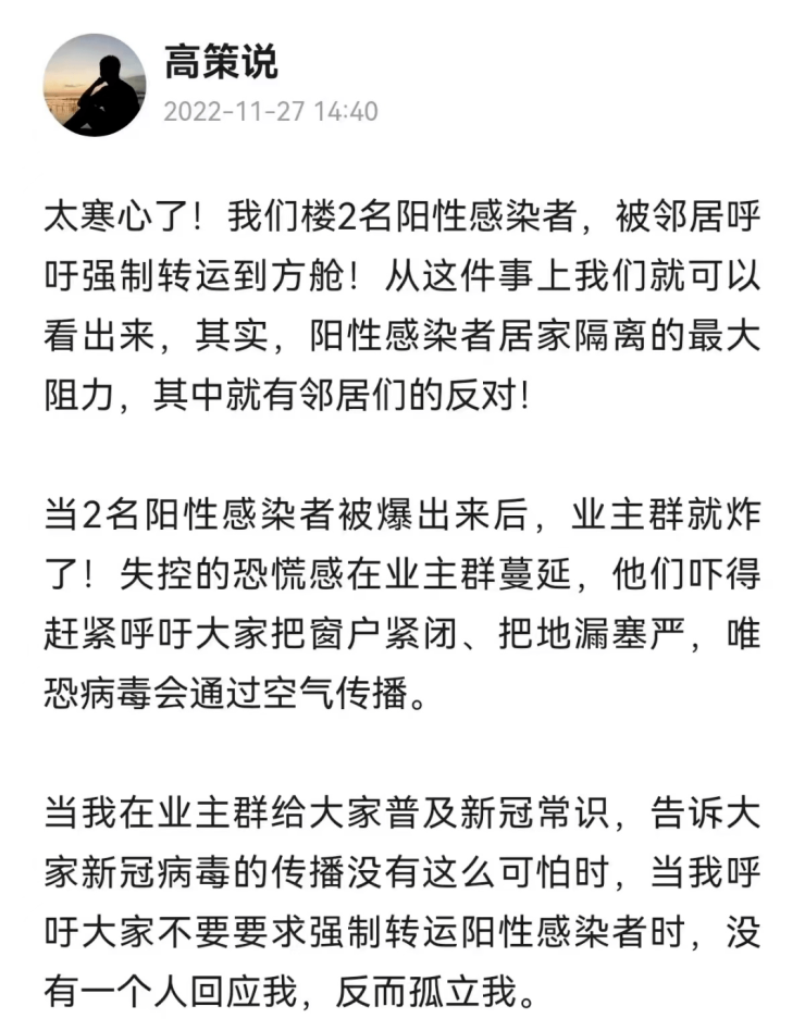 前几天刷到一个博主分享:小区有2名病例,被邻居呼吁强制转运到方舱⬇️。