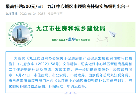 6月24日,九江市住建局等五部门发布《九江市中心城区申领购房补贴实施细则》,细化购房补贴对象及范围、补贴标准、申请流程等。