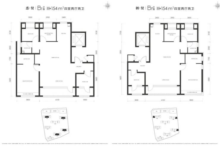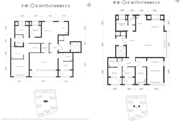 建面约173平米四居,项目的最大户型,同样两种格局。