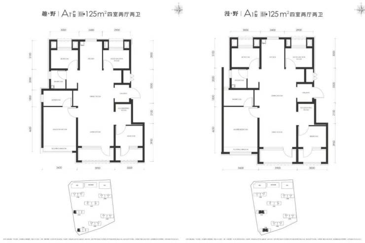 建面约125平米四居A1户型,分为边户及中间户。方正通透,四叶草格局,客厅面宽3.9米+大落地窗,主卧面宽3.6米+边户主卧设置拐角飘窗,其余三个次卧空间也不局促。户型比较实用。