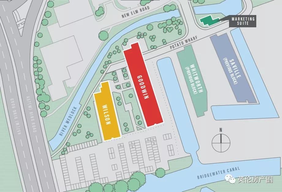 下图是一个项目中的四个楼,其中右边两个“Saville”和“Whitworth”已经竣工,红色的“Goodwin”和黄色的“Wilson”是我们现在在建售卖的。可以看到朝东南的户型都能看到运河河景,超西北面的户型也不错,可以看到苍翠的绿化和曼城城区。