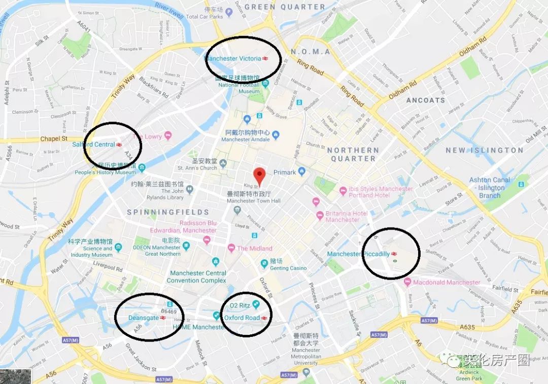 主城区一共5个火车站,从北到南排列分别是Victoria,Salford Central,Piccadilly,Deansgate以及Oxford Road,只要在这5个火车站附近,不论是曼城还是哪里,都挺方便的。