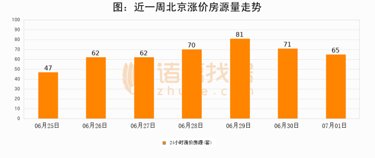 根据诸葛找房数据显示,北京24小时涨价房源量为65套,较06月30日减少6套,环比下降8.5%。与此同时,涨价房源占比小幅回落,对于购房者来说是一个入市窗口期,购房者可抓住时机入市。