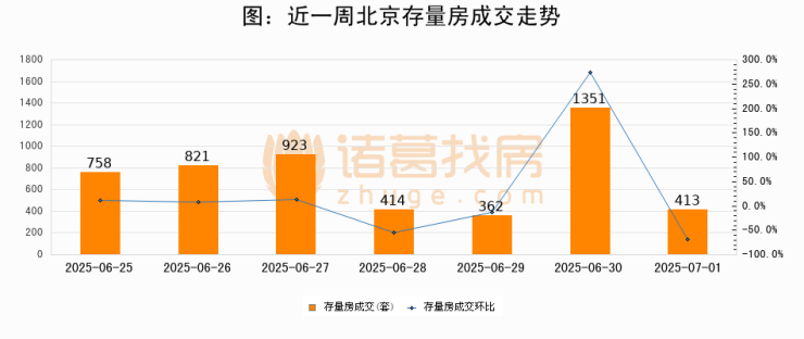 从存量房来看,2025年07月01日北京存量房单日成交413套,比昨日减少938套,环比下降69.4%。从近一周存量房成交来看,北京存量房日均成交套数为720套,07月01日单日成交413套,低于近一周平均水平42.6%。
