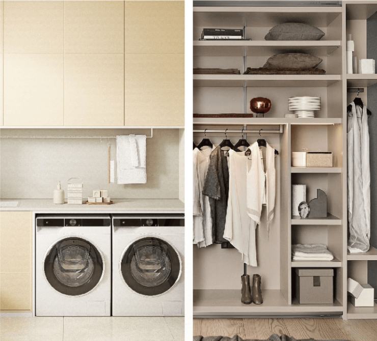 「智慧厨房收纳」体系,不仅收纳柜体空间丰富,动线规划也十分合理分区,核心功能触手可及,取洗切炒放时,告别手忙脚乱的厨房大战;「百宝餐边柜」则是以多尺寸规格收纳柜体,把空间还给生活,比如说茶具、酒杯、玩具、零食,空间各得其所;「卫生间收纳」利用隐形镜后柜及墙面柜体,无论是日常护肤的瓶瓶罐罐,还是网购囤货都能安放有序。