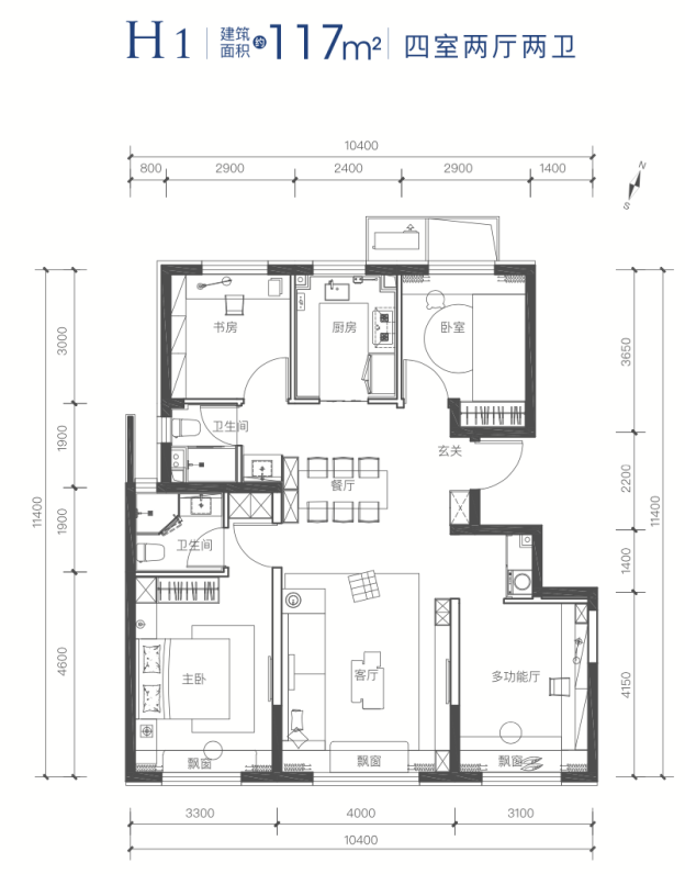 建面约117㎡四居,实用派的心头好。南向三面宽约10.4米,为保证每位家人的隐私感,我们以四叶草户型设计,将四个房间区隔,做到互不打扰。主卧套房设计+三段式干湿分离卫浴间,既能降低老人小孩滑倒的危险性,又能保证空间的干爽及洁净,还能实现洗漱高峰期的两人或多人同时使用,让生活更具品质。