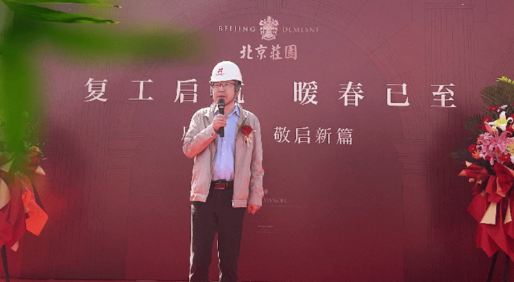 北京庄园项目负责人丁总在复工现场发表讲话,他表示,全面复工让人倍感欢欣鼓舞,公司全体同仁也将一如既往全力以赴,严控施工流程管理,满怀信心投身各项建设任务当中,时刻坚守精工细作的庄园匠心打造理念。