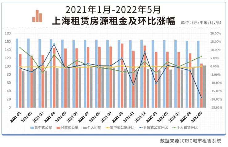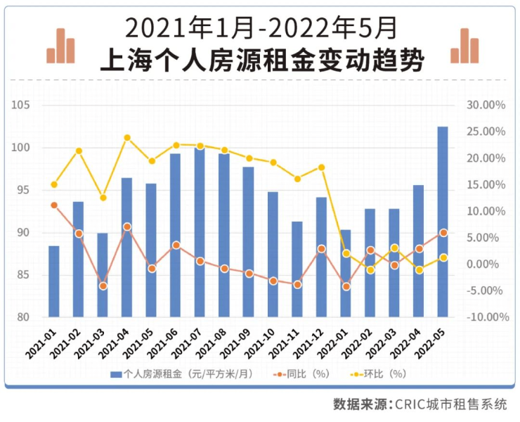 根据较新克而瑞租售数据显示,4月份,上海个人房源租金环比上涨3%。而5月,上海个人房源租金为102.51元/平方米/月,排在55城之首,也是少有一个每平方米月租金破百元的城市;环比上涨6%,涨幅排在55城前三。在疫情刚刚过去的两个月中,上海个人房源租金至少上涨了9个百分点。