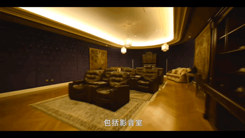 必不可少的有,影音室,配有真皮沙发、隔音扪布和吸音地毯。