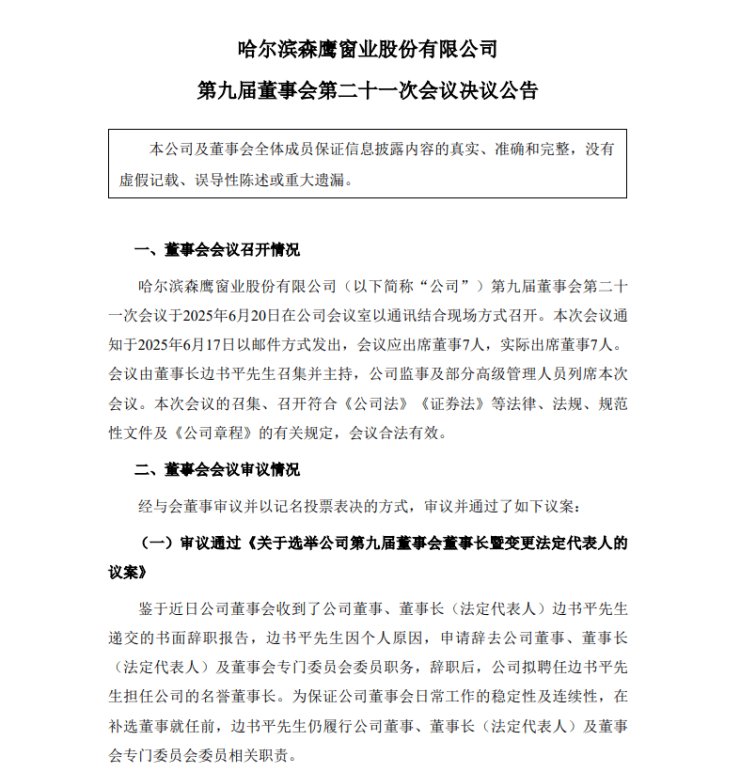 公告显示,森鹰窗业于2025年6月20日召开第九届董事会第二十一次会议,审议通过了《关于选举公司第九届董事会董事长暨变更法定代表人的议案》,同意选举边可仁为公司第九届董事会董事长,任期自公司股东大会审议通过补选非独立董事之日起至第九届董事会届满之日止。
