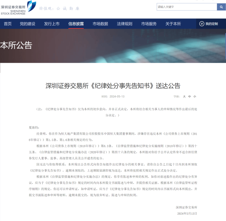 深交所拟对恒大集团原董事夏海钧作出处分