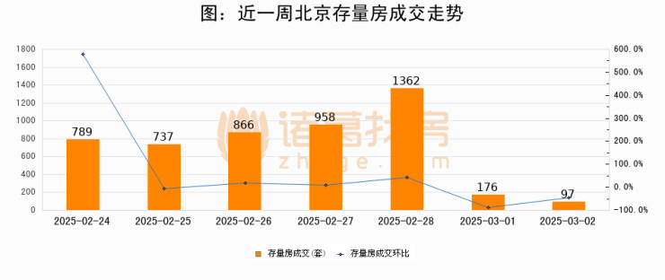 从存量房来看,2025年03月02日北京存量房单日成交97套,比昨日减少79套,环比下降44.9%。从近一周存量房成交来看,北京存量房日均成交套数为712套,03月02日单日成交97套,低于近一周平均水平86.4%。