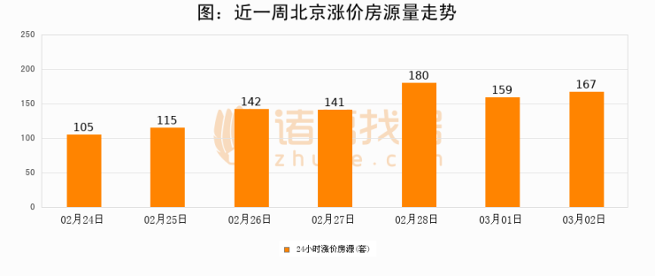 根据诸葛找房数据显示,北京24小时涨价房源量为167套,较03月01日增加8套,环比上涨5%。与此同时,涨价房源占比小幅扩大,业主信心有所提升。