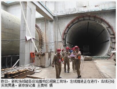 昨日下午,记者在新机场线磁各庄站盾构区间的施工现场看到,几人高的盾构机正在左线内进行着掘进作业,而右线已经实现贯通。