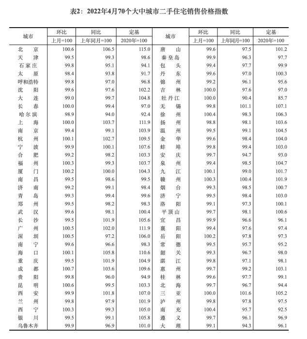 2022年4月70个大中城市二手住宅销售价格指数。截图自国家统计局官网