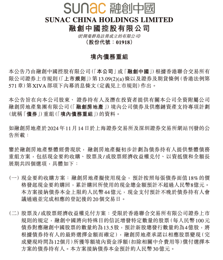 11月14日,融创中国控股有限公司发布境内债务重组的公告,披露了公司境内债券二次重组方案,方案涵盖了现金要约收购、股票及股票经济收益权兑付、以资抵债和全额长展期四个选项。