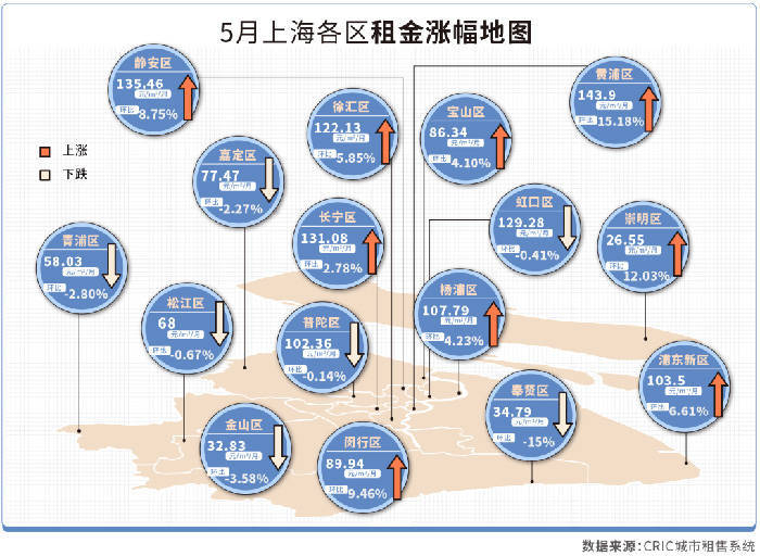 克而瑞租售数据显示,黄埔、静安、徐汇、闵行等白领租住群体聚居地涨幅明显,而青浦、松江、奉贤等区则出现了不同程度的下降。