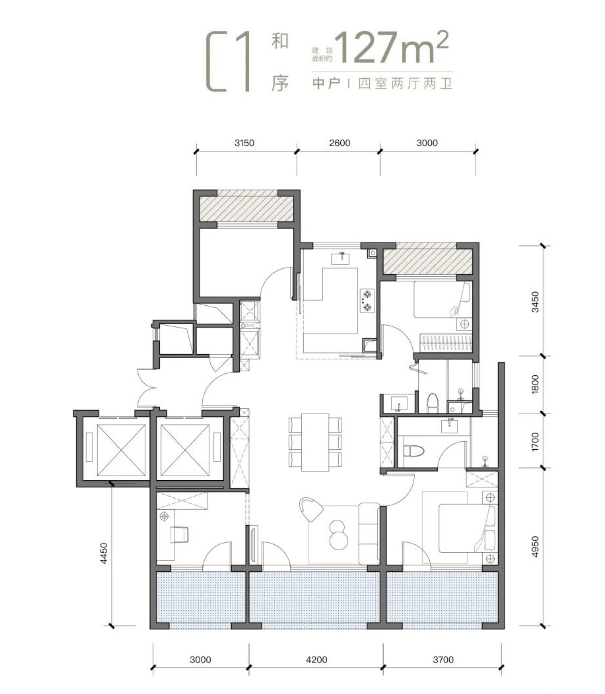 127㎡四居:共计245套,使用面积可达117㎡左右,实际使用率将近93%,赠送面积约21㎡,独立电梯厅可作外玄关,四叶草布局,客厅+餐厅+阳台一体化设计,面宽达10.9米,客厅面宽4.2米,南向三面宽+北向双设备平台,主卧套间270°转角飘窗,面积达25㎡,配备步入式衣帽间带观景浴缸,独立玄关柜/家政间+中西厨+岛台设计,北向双设备平台全赠送,北向双次卧分别作为老人房与儿童房,中间客卫便捷使用,三代同堂互不干扰。