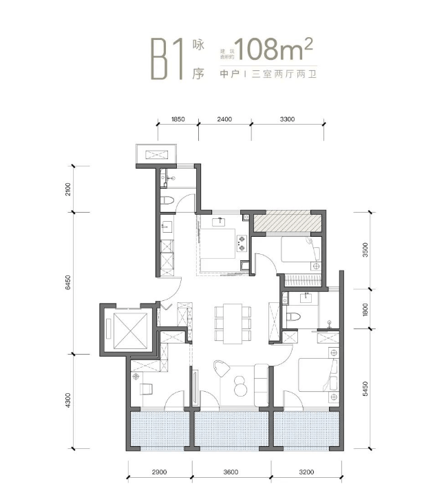 108㎡三居:共计288套,使用面积可达99㎡左右,套内使用率将近93%,赠送面积约12㎡,南向三面宽,面宽达12.5米,通体落地窗设计,LDK一体化布局,半开放厨房衔接西岛台,独立玄关入户,客厅面宽4.1米,主卧270°L型飘窗,北侧客卫位于次卧与书房之间,动线稍显绕。