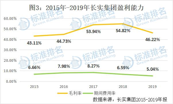 图3显示,长实集团的毛利率由2015年的43.11%持续增加至2018年的54.82%,随后有所下降。2019年其毛利率为46.22%,较2018年下降了8.6个百分点。