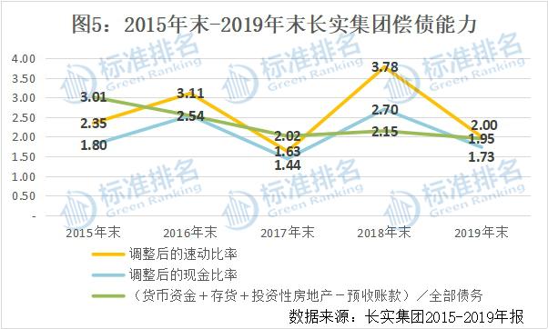 反映长实集团长期偿债能力的指标“(货币资金+存货+投资性房地产-预收账款)/全部债务”于2015年末的3.01持续下滑至2017年末的2.02,在2018年微增后再次下滑至2019年末的1.95,为近四年较低水平。结合总体数值分布来看,长实集团的偿债能力非常强劲。