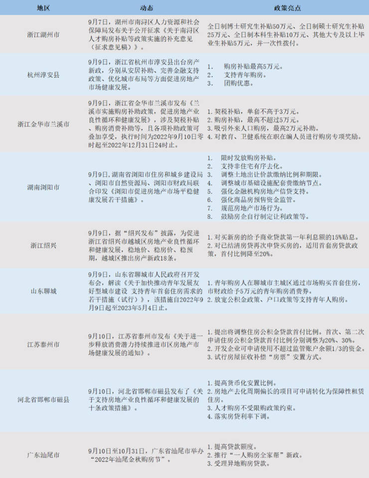 进入传统销售旺季“金九银十”,浙江杭州淳安县、广东汕尾市、河北邯郸市等三线、四线城市集中出台“金秋”购房新政,放宽楼市调控政策。