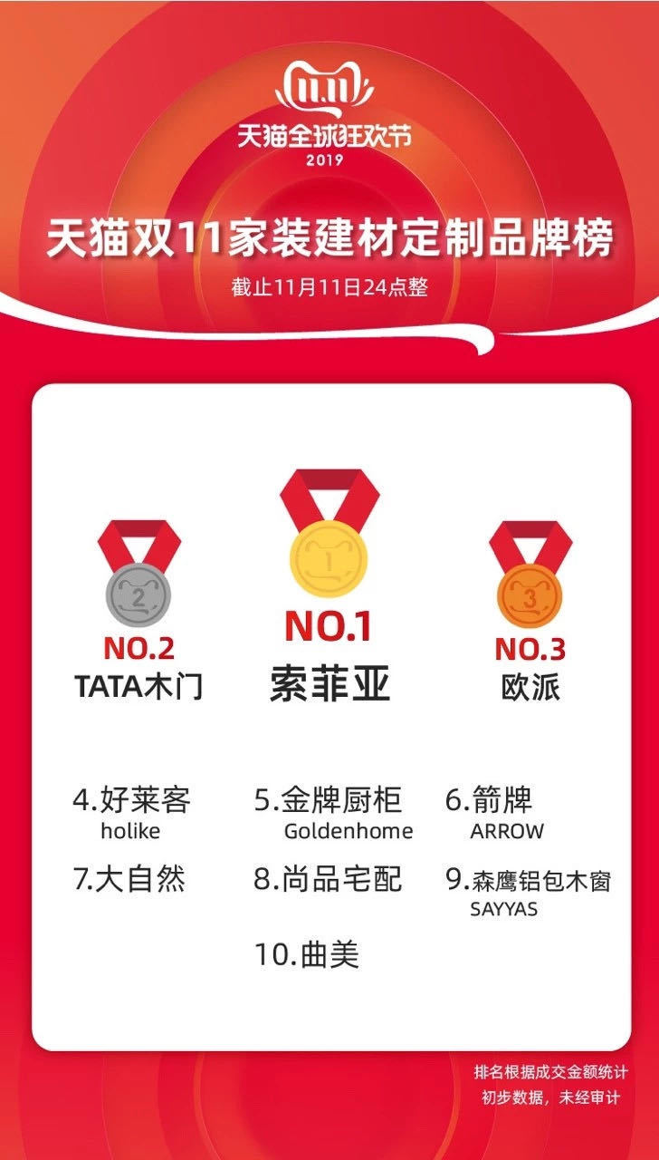 一年一度的双十一狂欢节落下了帷幕,在2019年全新的线上商业市场格局下,国内木门领军品牌TATA木门成绩相当亮眼:双十一前41分钟全网破亿,以成价额8.42亿位居天猫双十一家装建材定制品牌榜亚军,轻松进入过亿品牌榜俱乐部。