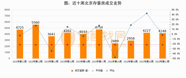 存量房方面,第21周北京存量房成交4148套,较上周减少79套,环比下降1.9%。从近十周成交走势来看,周均成交套数为4073套,本周高于平均水平1.8%。