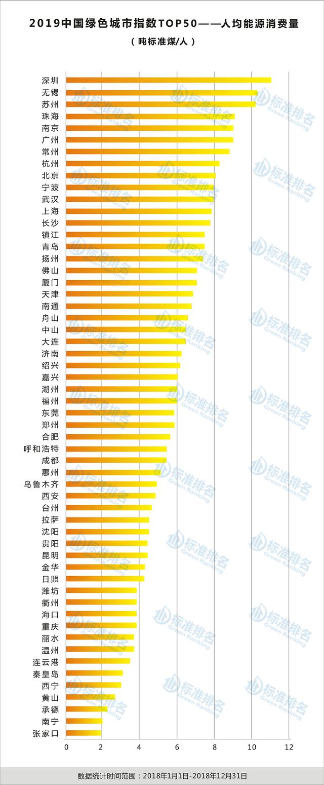 《2019年中国绿色城市指数TOP50报告》显示,黄山市的人均能源消费量为2.8吨标准煤,位于榜单倒数第4位,人均能耗水平较低。