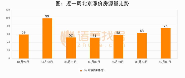 根据诸葛找房数据显示,北京24小时涨价房源量为75套,较05月04日增加12套,环比上涨19%。与此同时,涨价房源占比小幅扩大,业主信心有所提升。