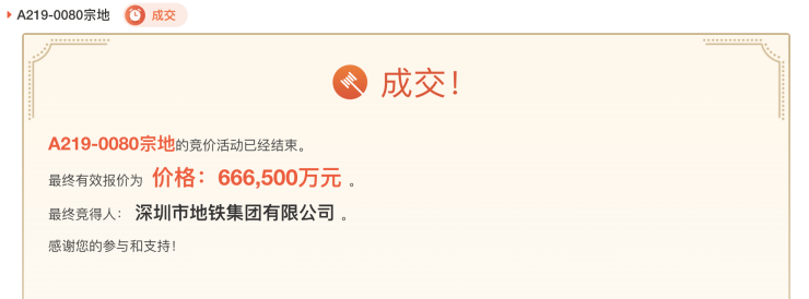 根据成交结果,深圳市地铁集团有限公司以底价66.65亿元摘得上述地块,成交楼面价22994元/平方米。