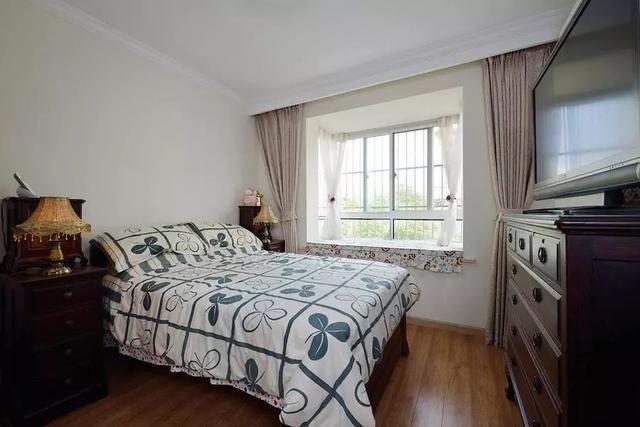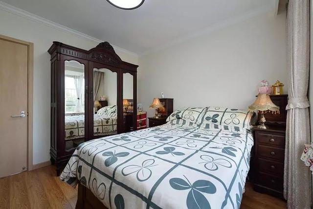 ▲老人房是对称的布局,铺了自然清新的被单,放了一个古董座钟式的镜面衣柜,整体打造了端庄沉稳的卧室格局。