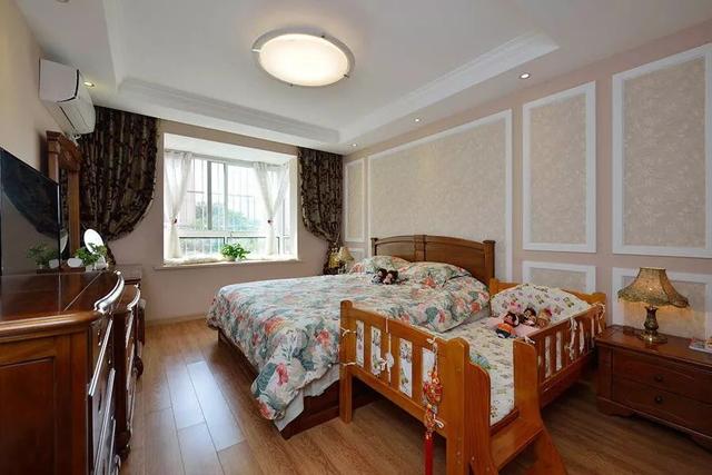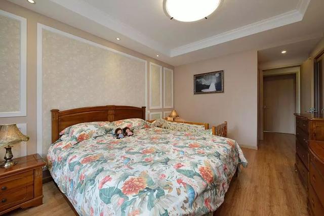 ▲床头背景墙做了边框造型处理并辅以壁纸作装饰,配合浪漫碎花的被单,精致高雅又不失情趣温情。