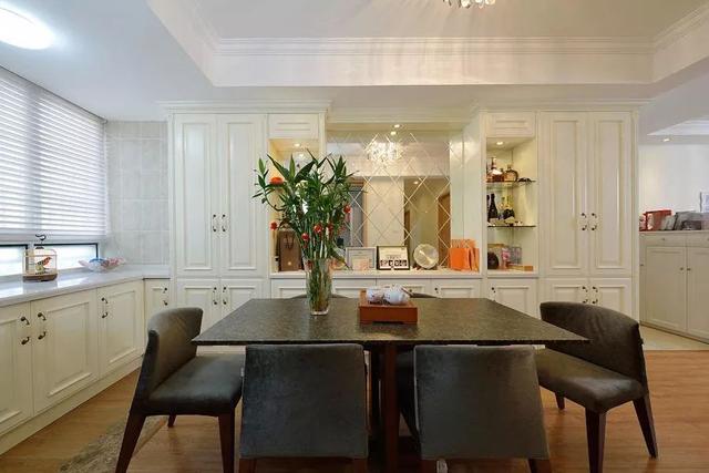 ▲深色的餐桌餐椅搭配白色的餐边柜,显得静雅大方。而留空的墙面做了镜面处理,柜中的摆件也因此更具精致质感。